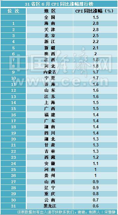31省區(qū)6月CPI同比漲幅排行榜。制表人:宋雅靜