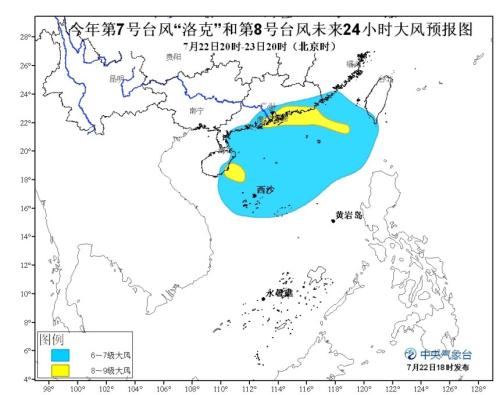 中央氣象臺發布大風預報:22日20時至23日20時,海南島東部沿海、廣東沿海、臺灣南部沿海、南海中部和北部、巴士海峽、西沙群島及附近海域將有6-7級大風,臺風中心經過的附近海域風力可達8-9級,陣風10-11級。