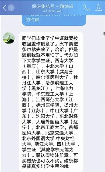 北青報記者在加其名為“保研集結號~魏編輯”的QQ號后,對方立即發來“同學們畢業了學生證就要被收回蓋作廢章了;疖嚻贝艞l也就失效了,哈哈,但是遇到我不怕……”的消息,同時發出的可以代辦的大學學生證的學校名,其中包括首都醫科大學、北京交通大學、北京外國語大學、浙江大學、四川大學等全國二十余所高校。隨后還發來“260元帶磁條,70元只辦學生證但會送假磁條,贈送實物注冊章”等字樣。