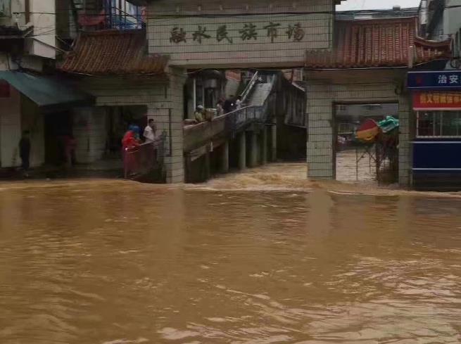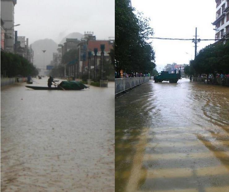 受上游持續強降雨影響,廣西融水縣融江水位猛漲, 13日晚上11點半左右,洪水開始涌入融水縣城,城區低洼地段被泡。