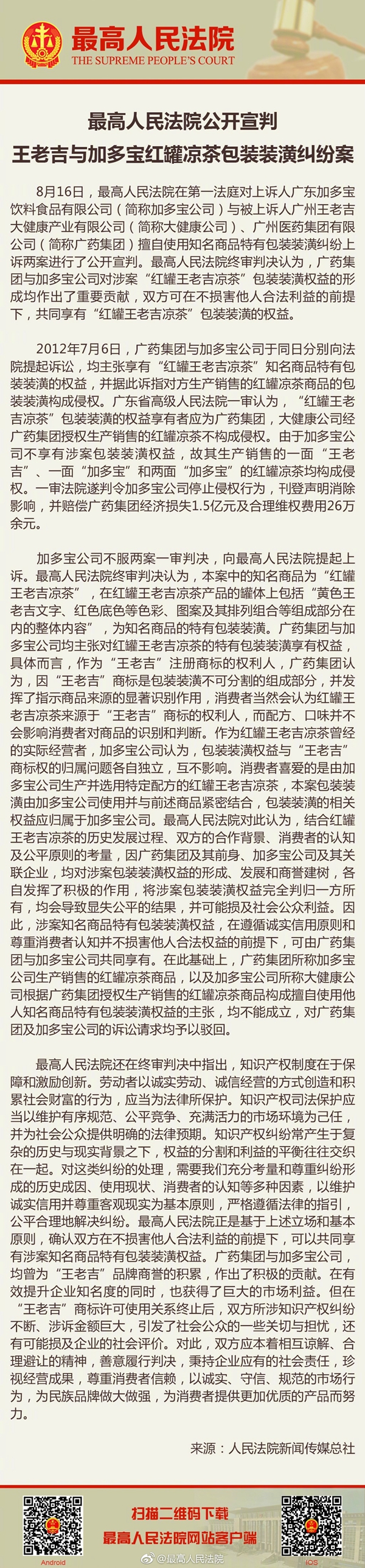最高人民法院今天在第一法庭對上訴人廣東加多寶飲料食品有限公司(簡稱加多寶公司)與被上訴人廣州王老吉大健康產業有限公司(簡稱大健康公司)、廣州醫藥集團有限公司(簡稱廣藥集團)擅自使用知名商品特有包裝裝潢糾紛上訴兩案進行了公開宣判。最高人民法院終審判決認為,廣藥集團與加多寶公司對涉案“紅罐王老吉涼茶”包裝裝潢權益的形成均作出了重要貢獻,雙方可在不損害他人合法利益的前提下,共同享有“紅罐王老吉涼茶”包裝裝潢的權益。(新民晚報 潘子璇)
