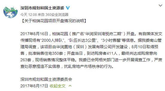 8月16日,柏瑞花園(推廣名“華潤深圳灣悅府二期”)開盤。有自媒體發文傳播現場有“2000人排隊”、“隊伍長達3公里”、“3小時售罄”等信息。據深圳市規劃和國土資源委員會南山管理局調查,該項目由華潤置地(深圳)發展有限公司開發建設,8月10日取得預售,批準銷售住宅350套;開盤當日,到訪購房者411人,最終共達成購房意向263套,現場銷售情況整體平穩。深圳市規劃和國土資源委員會已會同相關部門進一步開展調查工作,嚴肅查處惡意捏造不實信息,擾亂房地產市場秩序的行為。