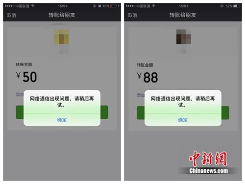 中新網北京8月21日電(程春雨 吳濤)21日下午,有網友反映,微信轉賬出現故障,提示“網絡通信出現問題,請稍后再試”。記者多次試驗,確實如此。不過發紅包功能不受影響。