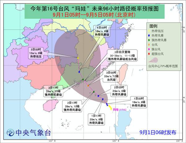預(yù)計,“瑪娃”將以每小時10公里左右的速度向北偏西方向移動,強度逐漸加強,并向廣東中部一帶沿海靠近,將于3日白天在這一帶沿海登陸,登陸時強度為強熱帶風暴級或臺風級(30-38米/秒,11-13級),登陸后迅速減弱。