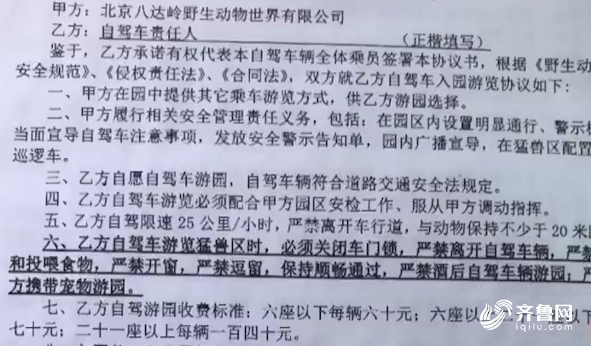 這份《自駕車入園車損責任協議書》也被網友戲稱為生死契,里面第4條黑體加粗的明確寫明嚴禁開窗、嚴禁喂食、嚴禁逗留,同時協議書的第十條也寫明,甲乙雙方有違上訴協議內容,各自承擔相關責任。動物園方面表示,如果不簽署這份協議,是沒有辦法進園游覽的。