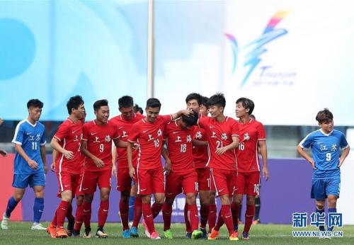 在第十三屆全運會足球男子20歲以下年齡組比賽中,上海隊以4比2戰勝江蘇隊。 新華社記者 曹燦攝
