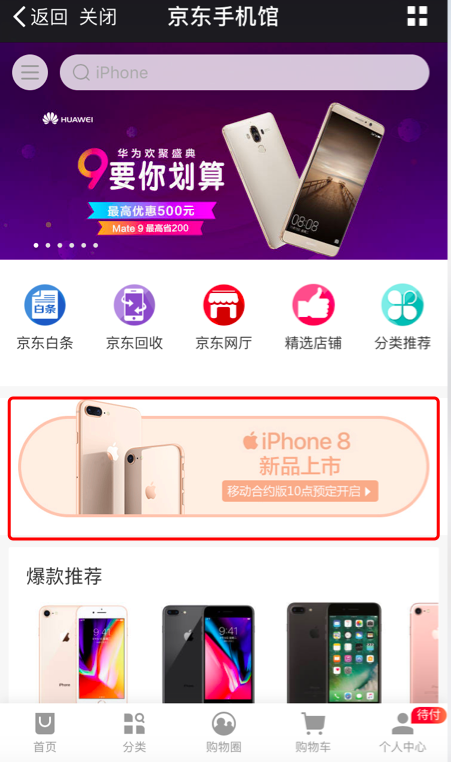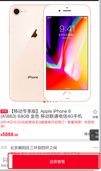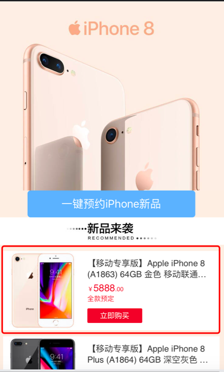 消費者可以在自己的微信“發(fā)現(xiàn)”頁面點擊“購物”,進(jìn)入京東頁面點擊“京東手機”后,點擊iPhone 8新品上市的廣告,即可看到移動專項版的iPhone8售賣信息,點擊“立即購買”即可完成預(yù)購下單。具體操作示例如下: