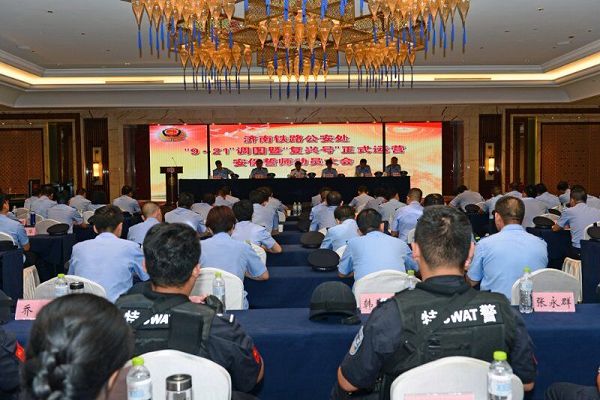 央廣網(wǎng)濟南9月21日消息(記者于聞 通訊員 張弦)“復(fù)興號”標準動車組9月21日在京滬高鐵正式運營,率先達到350公里時速。為確保“復(fù)興號”的運營安全,濟南鐵路公安處提前布局,在泰安召開“9·21”調(diào)圖暨“復(fù)興號”正式運營安保誓師動員大會,濟南西站派出所干警代表共20人參加了動員大會。大會號召全體干警繼續(xù)保持高昂的斗志,不惜一切代價,集中全部精力,戰(zhàn)勝一切困難,確保“復(fù)興號”正式運營的絕對安全。大會舉行了安保誓師動員集體宣誓儀式。
