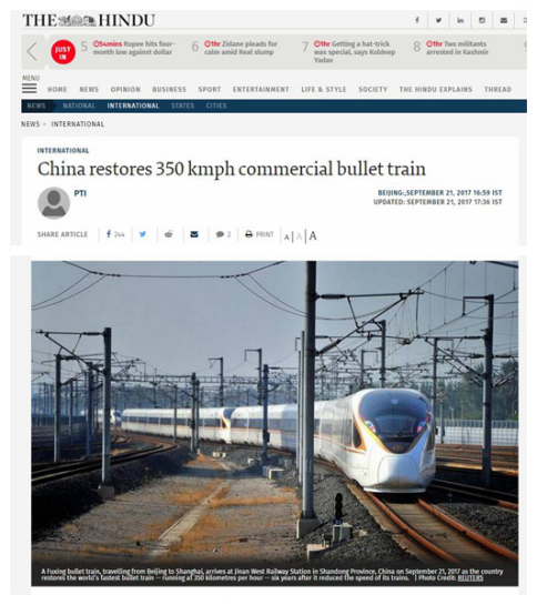 《印度教徒報(bào)》寫道,北京到上海有1318公里的路程,上午9點(diǎn)出發(fā)的列車只用4小時(shí)28分便可抵達(dá)終點(diǎn)。這比原來的運(yùn)行時(shí)間又縮減了近1個(gè)小時(shí)。報(bào)道還注意到“復(fù)興號(hào)”的“純正中國(guó)血統(tǒng)”,稱列車的知識(shí)產(chǎn)權(quán)完全屬于中國(guó)。
