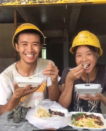 劉磊(左一)、李霞夫婦在工地吃午飯時(shí)錄制視頻, 該視頻在平臺(tái)點(diǎn)擊量達(dá)88萬(wàn),有近4000條評(píng)論。