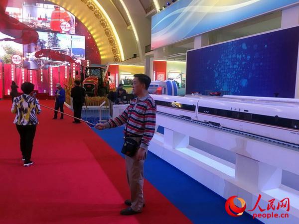 黨的十八大以來,中國新開通高鐵1.36萬公里,高鐵營業里程突破2.2萬公里,穩居全球榜首。成就展上,“復興號”動車組模型如同一條銀色的蛟龍,引來很多觀眾合影留念。