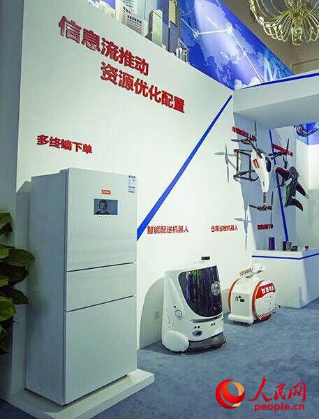 在展會現場,京東工作人員向觀眾展示了京東智慧生態鏈下的智能生活場景:凌晨2點,消費者打開家中的美的智能冰箱,發現冰箱空空如也,便在冰箱上下單,終端口1秒內便完成人工智能推薦,消費者很快便選定下單。而早在下單10小時之前,京東已經通過大數據監控預測了消費者購買意向,提前完成了商品調撥。因此,下單后5秒鐘,京東的無人倉內便開始運轉:自動叉車負責搬運貨物,立體庫穿梭車自動揀貨,AGV自動搬運揀貨,六軸機器人自動碼垛,全自動分揀機器人分揀貨物……下單后2小時,消費者購買的產品已經送往配送站,同時利用大數據實現了路徑優化和實時監測。下單后4小時,無人機起飛,貨物開始發往目的地。隨后無人機出動,負責最后一公里的運輸,成功將貨物送到消費者手中。