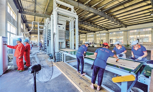 浙江湖州市南潯區一家木地板企業的工人使用“電能替代”改造后的熱壓機加工木地板。 新華社記者 徐 昱攝