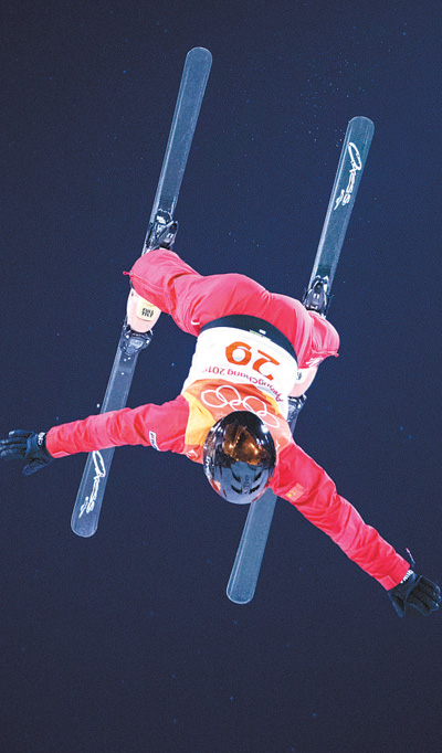 16日,中國選手張鑫在參加平昌冬奧會自由式滑雪女子空中技巧決賽。 本報記者 史家民攝