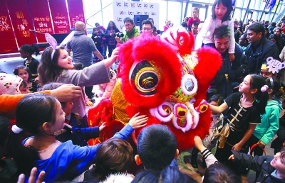 2月19日,在加拿大米西索加市演藝中心,小朋友們與舞獅玩耍。新華社發