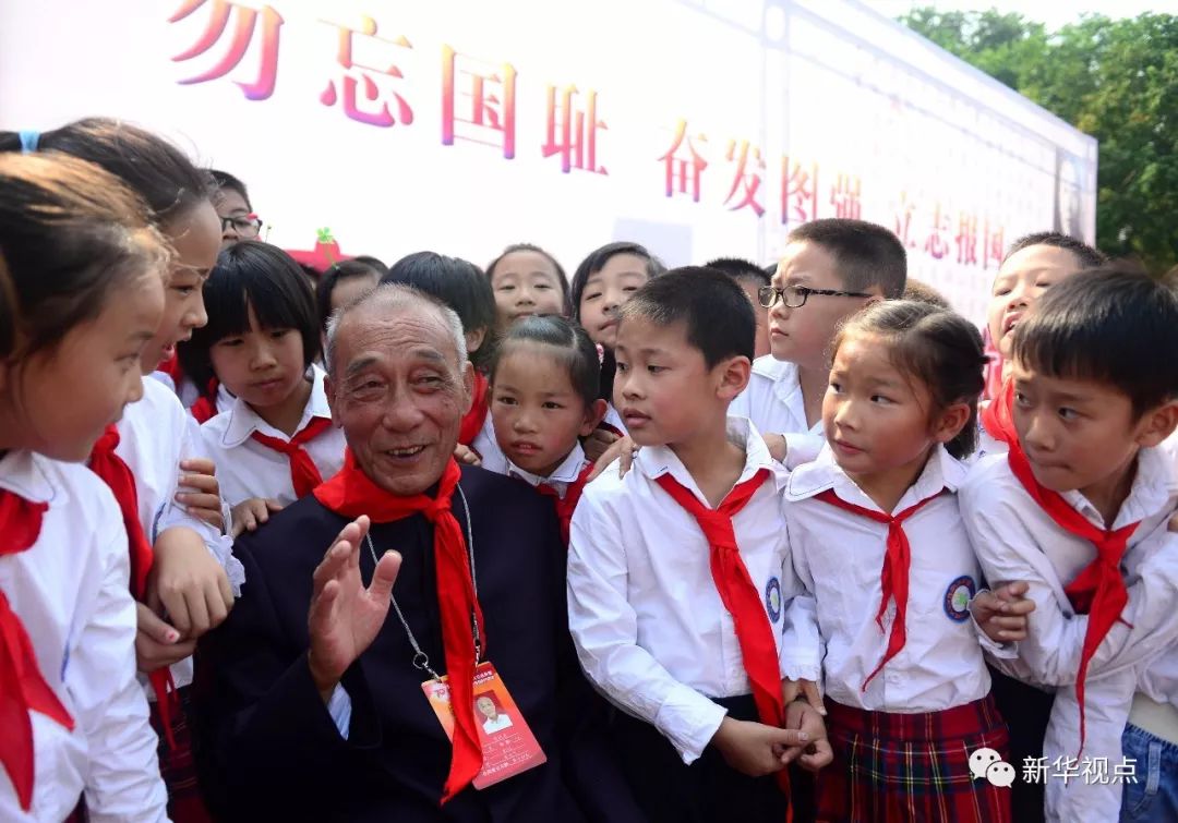 2015年9月18日,抗戰烈士蔡炳炎之子蔡浙生為安徽省合肥市朝霞小學學生講述抗戰故事。新華社記者 劉軍喜 攝