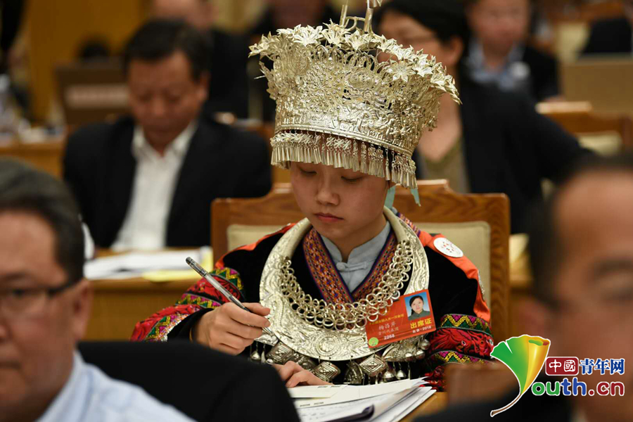 身著苗族特色服裝,手持竹編杯套,在2018年全國兩會首場“代表通道”上,從容而自信地向全世界人民介紹赤水竹編工藝文化和赤水人民脫貧致富的故事。