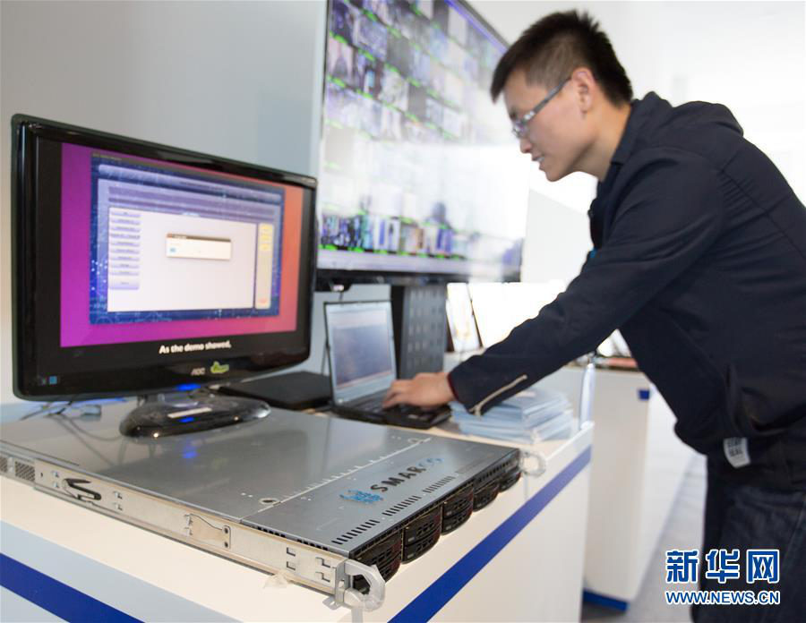 2017年12月,北京智能計算產(chǎn)業(yè)研究院舉行的發(fā)布會上,工作人員現(xiàn)場演示高通量人工智能一體機的應(yīng)用。(圖片來源:新華社)