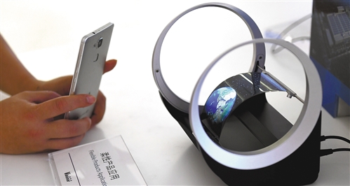 投資近300億元、具有完全自主知識產權的維信諾(固安)第六代全柔AMOLED生產線日前在河北省廊坊市固安產業新城正式啟動運行。圖為一名參觀者在維信諾展廳拍攝可彎曲屏幕。 新華社記者 王 曉攝