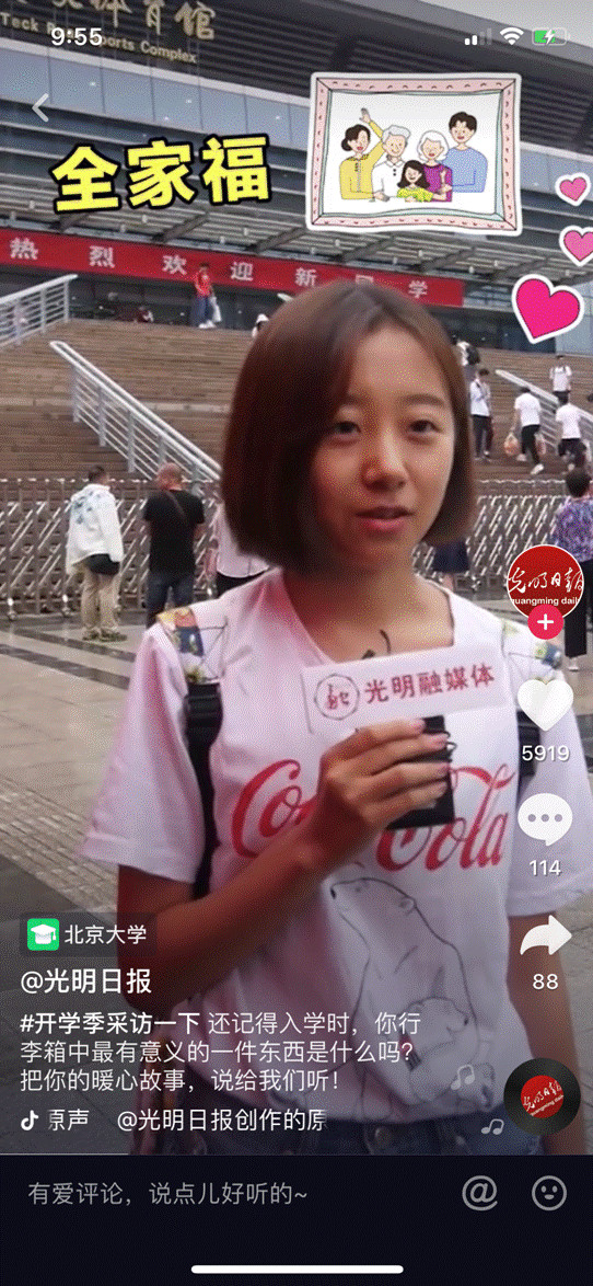 光明日?qǐng)?bào)記者則來到北京大學(xué),對(duì)00后新生和老生們進(jìn)行了街頭采訪。當(dāng)問及“入學(xué)時(shí),行李箱里最有意義的一件東西時(shí)”,有的說是全家福,有的說是電吉他,還有愛好二次元的同學(xué)帶了最喜歡的手辦來到學(xué)校。