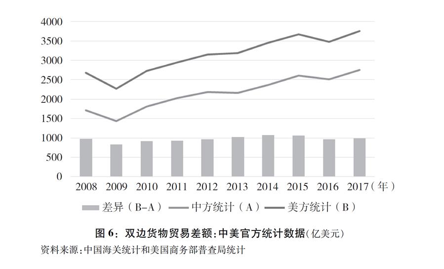 此外,美國統計方法相對高估了中美貨物貿易逆差額。中美雙方的統計差異長期存在,且差異較大。2017年,中國統計對美貨物貿易順差為2758億美元,美國統計對華逆差接近3958億美元,相差1000億美元左右。由中美兩國商務部相關專家組成的統計工作組,每年就中美貿易統計差異進行一次比較研究。根據該工作組測算,美國官方統計的對華貿易逆差每年都被高估20%左右。根據中國海關和美國商務部普查局的統計,雙方統計結果在最近十年來的走勢和變動幅度大致相同(圖6)。引起差異的原因包括進口價格和出口價格之間的差異、轉口貿易增值、直接貿易加價、地理轄區、運輸時滯等。