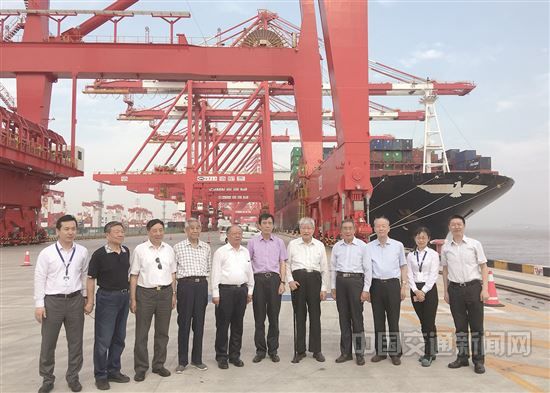 交通運(yùn)輸部老領(lǐng)導(dǎo)黃鎮(zhèn)東(左五)、王展意(左四)、林祖乙(右五)、劉松金(右四)、洪善祥(左三)、胡希捷(左二)、楊利民(右三)日前參加部離退休部長黨支部活動,考察上海港洋山港區(qū)四期碼頭。特約記者黃京麗攝