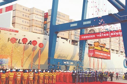2007年11月28日,中國大陸港口當(dāng)年第一億個(gè)集裝箱緩緩在天津港五洲國際碼頭起吊。