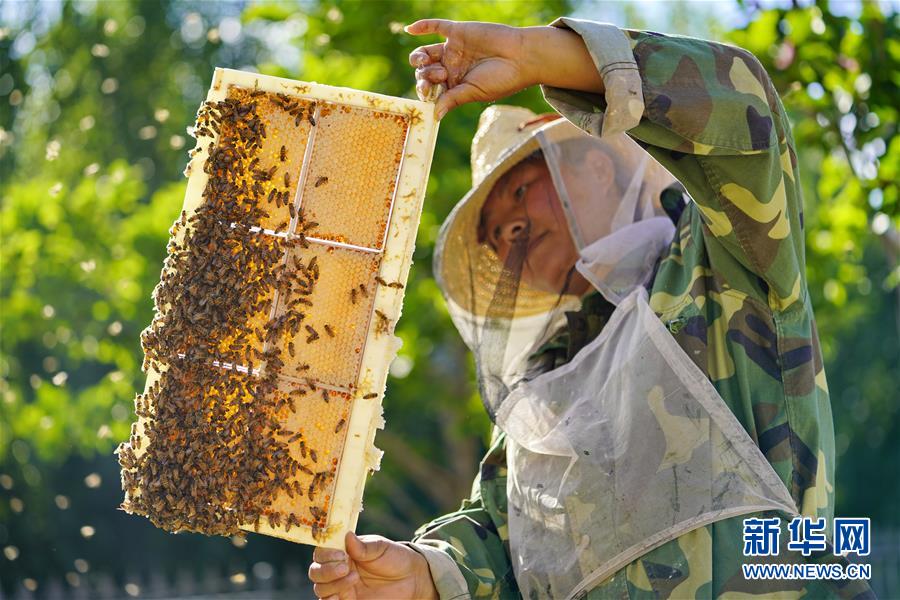 河北省唐山市豐潤區五鳳頭村百草坡現代農業園區的工作人員在采集蜂蜜(6月28攝)。 新華社記者 牟宇 攝