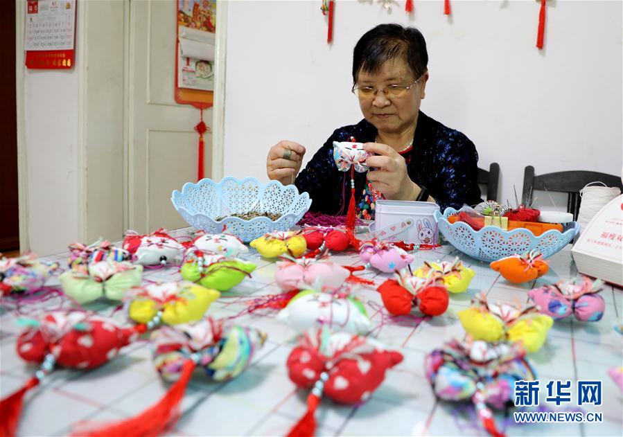 6月3日,在江蘇省蘇州市金閶街道,居民季國琴老人制作虎頭香囊。 端午將至,人們參加多彩民俗活動迎接傳統節日的到來。 新華社發(杭興微 攝)