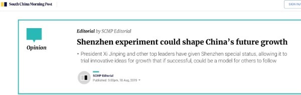 香港《南華早報》也發(fā)表社論稱,深圳是中國市場改革開始的地方,因此,北京自然應(yīng)該從這座城市尋找靈感,推動中國進入下一個發(fā)展階段。中國領(lǐng)導(dǎo)人賦予了它特殊的地位,允許它嘗試創(chuàng)新的增長理念,如果成功,可以成為其他城市效仿的榜樣。深圳將有空間進行試驗,以推動其“以創(chuàng)新為中心的發(fā)展戰(zhàn)略”。