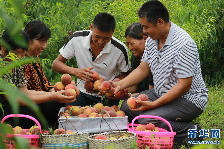 2019年7月18日,河南省光山縣馬畈鎮太平村瑞全家庭農場,村民們在桃園內收獲黃金蜜黃桃。