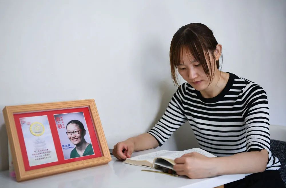 陳志昊在家中翻看碩士論文參考資料,旁邊放著她在武漢戰疫一線的留影(5月10日攝)。新華社記者 鄧華 攝