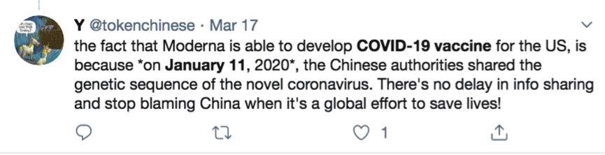 網民Y表示:“事實上生物制藥公司Moderna有能力為美國進行新冠病毒疫苗研發,因為始于‘1月11日’,以及中國政府及時分享了基因序列。這就說明信息共享不存在延遲,再也不要指責中國說沒有及時共享信息了,現在需要全球努力去救治生命!”↓↓↓