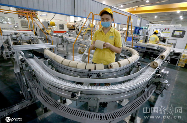 2019年9月17日,四川環龍新材料有限公司的工人們正在包裝生產“斑布”竹材料本色紙。近年來,四川省眉山市通過政策引導和資金扶持,加大對竹產業制造企業的技術改造。經過技術改造和投入后,企業產能效益及市場競爭力大幅提升。