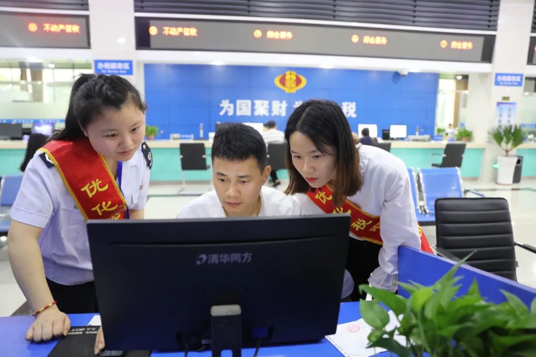 圖為共青城稅務局辦稅服務廳,稅務干部為前來辦稅的江西航師信息科技有限公司的法定代表人蘇明波進行“一對一”納稅申報業務輔導,助力大學生創新創業。