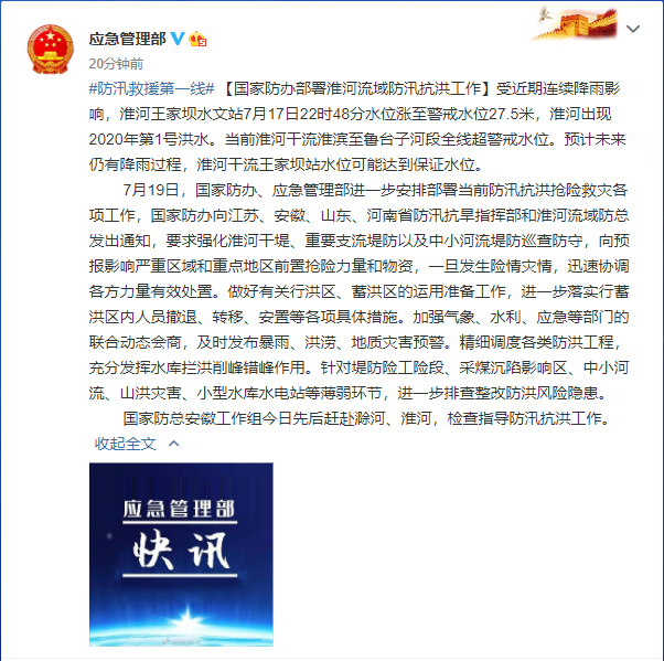 7月19日,國家防辦、應(yīng)急管理部進(jìn)一步安排部署當(dāng)前防汛抗洪搶險(xiǎn)救災(zāi)各項(xiàng)工作,國家防辦向江蘇、安徽、山東、河南省防汛抗旱指揮部和淮河流域防總發(fā)出通知,要求強(qiáng)化淮河干堤、重要支流堤防以及中小河流堤防巡查防守,向預(yù)報(bào)影響嚴(yán)重區(qū)域和重點(diǎn)地區(qū)前置搶險(xiǎn)力量和物資,一旦發(fā)生險(xiǎn)情災(zāi)情,迅速協(xié)調(diào)各方力量有效處置。做好有關(guān)行洪區(qū)、蓄洪區(qū)的運(yùn)用準(zhǔn)備工作,進(jìn)一步落實(shí)行蓄洪區(qū)內(nèi)人員撤退、轉(zhuǎn)移、安置等各項(xiàng)具體措施。加強(qiáng)氣象、水利、應(yīng)急等部門的聯(lián)合動態(tài)會商,及時發(fā)布暴雨、洪澇、地質(zhì)災(zāi)害預(yù)警。精細(xì)調(diào)度各類防洪工程,充分發(fā)揮水庫攔洪削峰錯峰作用。針對堤防險(xiǎn)工險(xiǎn)段、采煤沉陷影響區(qū)、中小河流、山洪災(zāi)害、小型水庫水電站等薄弱環(huán)節(jié),進(jìn)一步排查整改防洪風(fēng)險(xiǎn)隱患。
