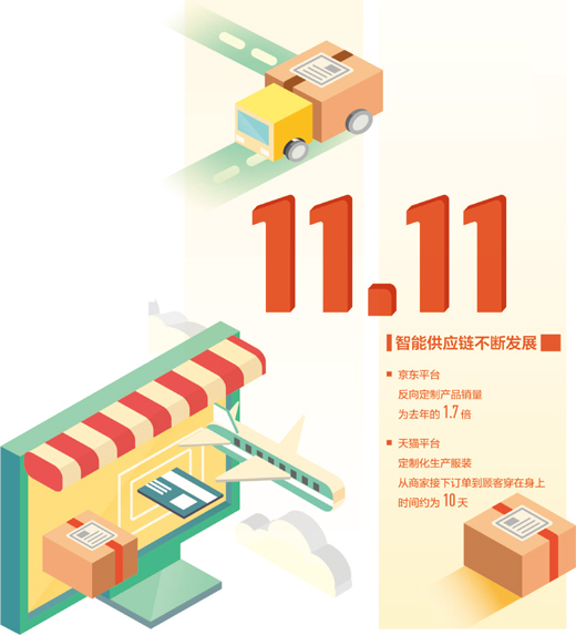 在京東平臺,智能供應鏈幫助500萬種商品進行銷售預測,每天給出超過30萬條智能供應鏈決策,相當于數萬名經驗豐富的銷售人員7×24小時不間斷工作。今年“雙11”,京東反向定制產品銷量為去年的1.7倍,許多“比你更懂你”的C2M商品成為品類第一。京東反向定制模式通過對生產端與消費端的雙重賦能,使新品到爆品轉換加快,而且效率不斷提升,覆蓋面不斷擴大。比如,京東家電通過大數據洞察到高端食材易腐易壞的保鮮痛點,推動家電企業(yè)研發(fā)出了保鮮功能更強大的冰箱,受到市場歡迎。