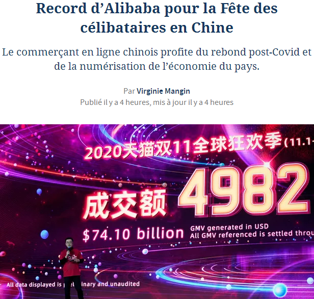 11月12日,法國《費(fèi)加羅報(bào)》報(bào)道稱,受益于中國新冠疫情后的消費(fèi)反彈以及數(shù)字經(jīng)濟(jì)的發(fā)展,中國電商阿里巴巴旗下天貓“雙11”銷售規(guī)模再破記錄。報(bào)道認(rèn)為,“雙11”現(xiàn)在已逐漸成為中國經(jīng)濟(jì)的“晴雨表”。