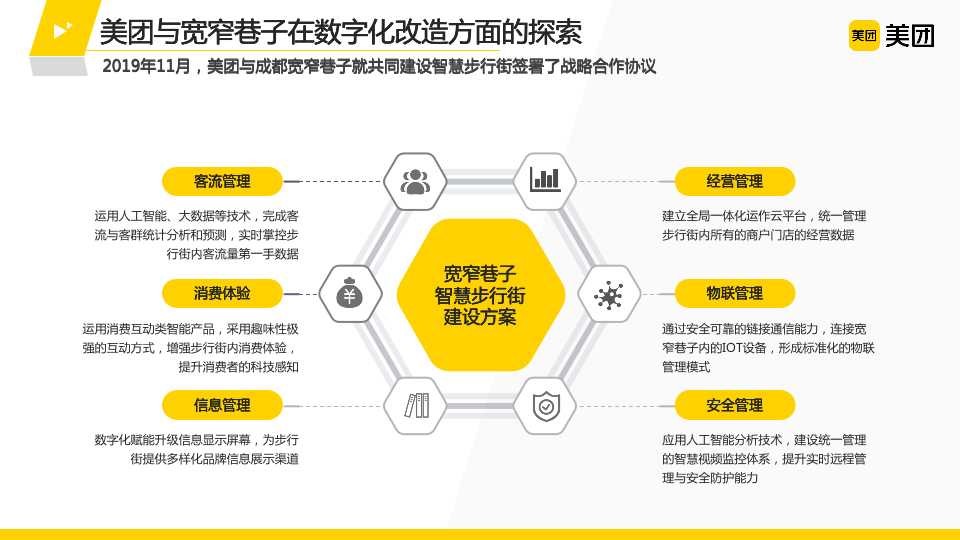 美團(tuán)與寬窄巷子合作改變了運(yùn)營(yíng)管理團(tuán)隊(duì)在精準(zhǔn)掌握步行街客流、交易用戶及經(jīng)營(yíng)管理等方面較為傳統(tǒng)的局面,為寬窄巷子提供了“全場(chǎng)景引流+新消費(fèi)體驗(yàn)+智慧化管理”三位一體的數(shù)字化解決方案:在線下,通過在街區(qū)建設(shè)智慧商圈大屏、部署智慧攝像頭,為商戶鋪設(shè)美團(tuán)餐飲系統(tǒng)軟硬件設(shè)備等舉措,寬窄巷子運(yùn)營(yíng)管理團(tuán)隊(duì)能實(shí)時(shí)查看步行街內(nèi)客流和消費(fèi)動(dòng)態(tài),當(dāng)發(fā)生客流過密等異常情況,會(huì)及時(shí)收到報(bào)警,進(jìn)而在疫情防控常態(tài)化下有效防范風(fēng)險(xiǎn),極大地提升了管理效率。在線上,美團(tuán)、大眾點(diǎn)評(píng)等App展示了“寬窄巷子”品牌館,通過“到店套餐”“代金券”“買單”等活動(dòng)為街區(qū)帶來更多關(guān)注和交易。