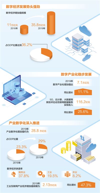 “通常理解,數(shù)字產(chǎn)業(yè)化主要是指為數(shù)字經(jīng)濟(jì)發(fā)展提供技術(shù)、產(chǎn)品、服務(wù)和解決方案的信息通信產(chǎn)業(yè)!敝袊畔⑼ㄐ叛芯吭赫(jīng)所副所長何偉介紹,“十三五”期間,大數(shù)據(jù)、云計算、人工智能等新技術(shù)蓬勃發(fā)展,我國數(shù)字產(chǎn)業(yè)化實(shí)力大幅提升。2019年,數(shù)字產(chǎn)業(yè)化增加值規(guī)模達(dá)7.1萬億元,占GDP比重7.2%,同比增長11.1%。