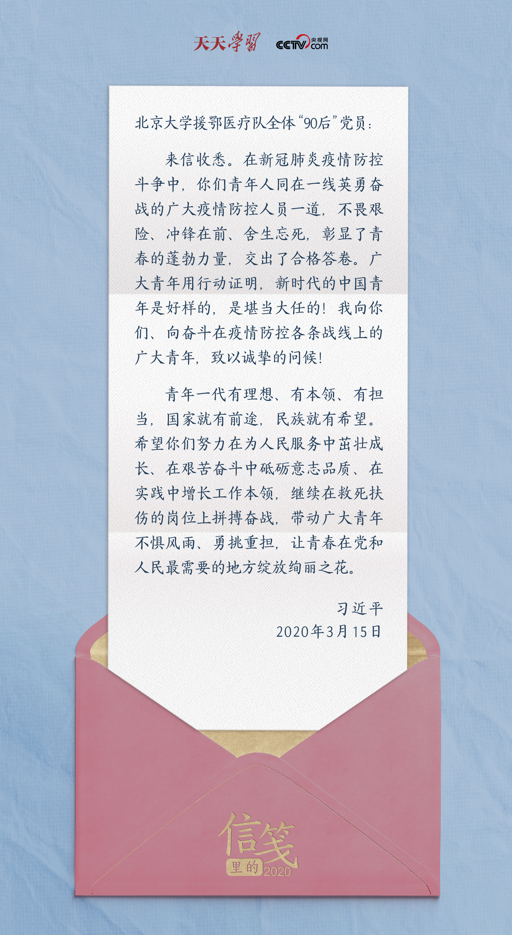 2020年3月15日,北京大學援鄂醫(yī)療隊全體“90后”黨員收到了總書記的回信;匦胖,總書記勉勵他們讓青春在黨和人民最需要的地方綻放絢麗之花。