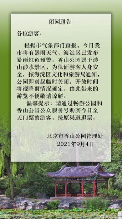 根據北京市氣象部門預報,今日(4日)北京市將有暴雨天氣。頤和園、香山公園和北京植物園屬于涉山涉水景區,為了保證游客人身安全,即刻起臨時關閉,開放時間將視雨晴而定。