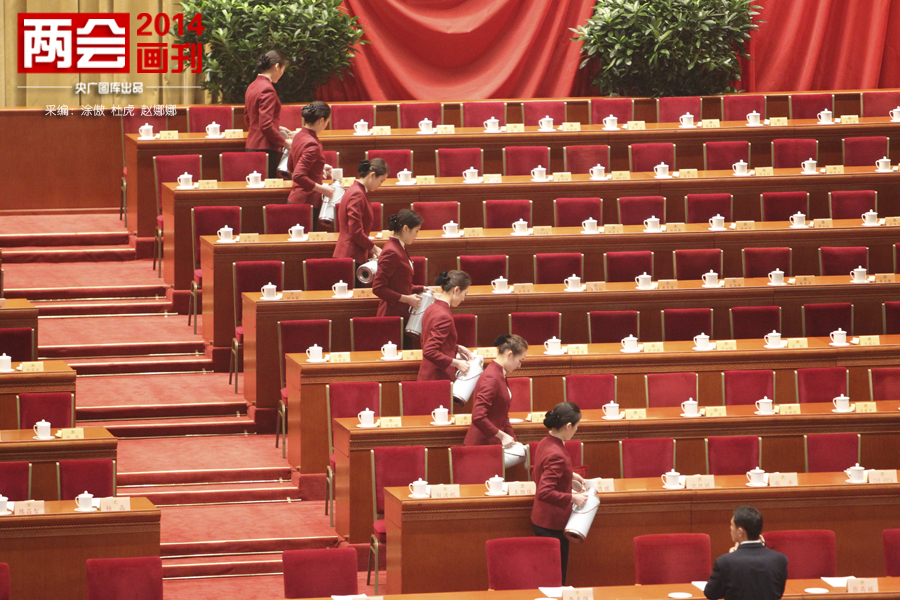 央廣網(wǎng)北京3月3日消息 3月3日,中國人民政治協(xié)商會議第十二屆全國委員會第二次會議在北京人民大會堂開幕。圖為工作人員做會前準(zhǔn)備(央廣網(wǎng)記者 杜虎 攝)