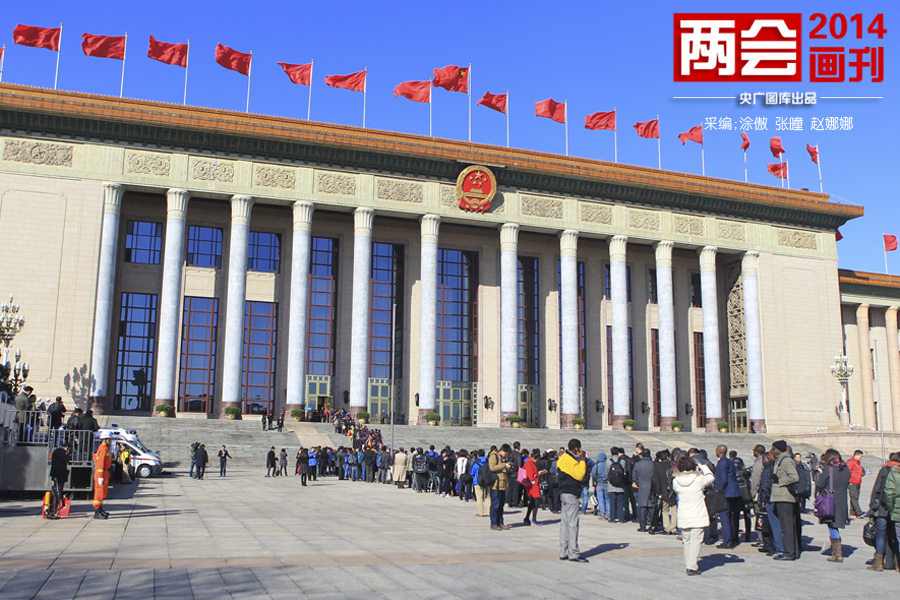 2014年3月4日,十二屆全國人大二次會議在人民大會堂舉行新聞發(fā)布會。圖為新聞發(fā)布會召開前記者排隊進(jìn)場(央廣網(wǎng)記者 張曈 攝)