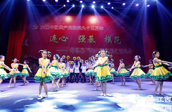 央廣網(wǎng)都昌7月1日消息(傅建斌)為慶祝中國(guó)共產(chǎn)黨成立九十三周年,6月30日晚,江西省九江市都昌縣舉行紀(jì)念中國(guó)共產(chǎn)黨成立93周年表彰文藝晚會(huì)。各群眾文藝團(tuán)隊(duì)以飽滿的熱情,用歌舞、竹板、漁歌等藝術(shù)形式慶祝黨的生日。