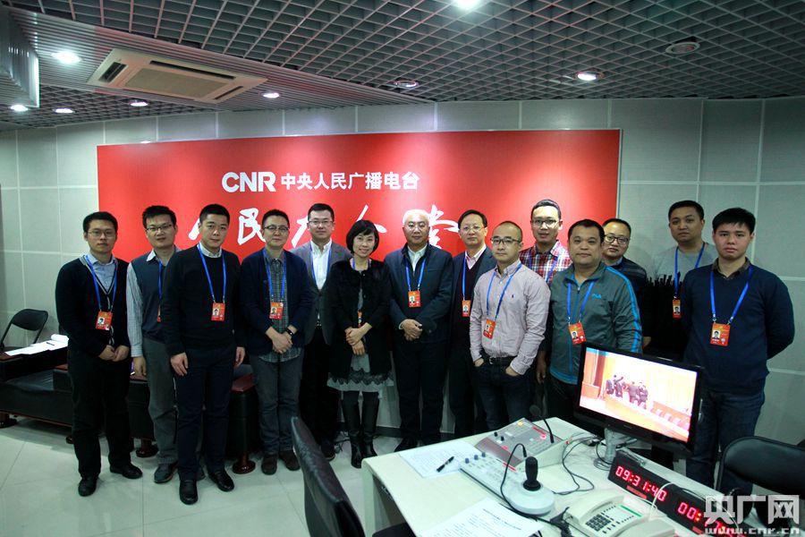 中央人民廣播電臺分黨組成員、副總編輯劉曉龍(左七)和前方直播人員一起在人民大會堂直播間。