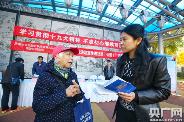“老百姓經(jīng)常遇到非法開展殯儀活動、非法公墓等行為,不僅利益遭受很大損失,而且服務也得不到保障。另外,還有一些非法養(yǎng)老機構打著養(yǎng)老的旗號從事非法活動,甚至還有一些社會組織以各種名義騙取錢財。”北京市民政綜合執(zhí)法監(jiān)察大隊大隊長王業(yè)涌表示,“開展‘民政法治宣傳進社區(qū)’活動,希望能多和老百姓接觸,加強民政執(zhí)法宣傳,提高老百姓對民政執(zhí)法的了解,進一步保護合法權益。同時,現(xiàn)在正值十九大勝利閉幕之際,加強對十九大精神的宣傳也是我們此次活動的主要目的,真心希望社區(qū)居民能夠通過我們此次活動有所收獲。”