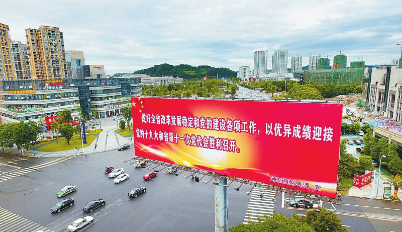 遂寧市在市區街頭設置了迎接省第十一次黨代會召開的巨幅標語牌。