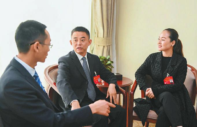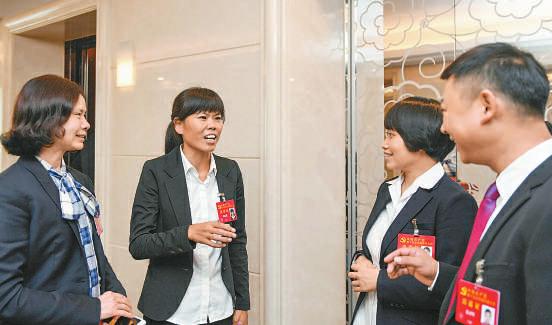 范國瓊代表(左一)、陳紹燕代表(左二)、陳小玲代表(左三)和張開輝代表在駐地暢談5年來身邊發生的可喜變化