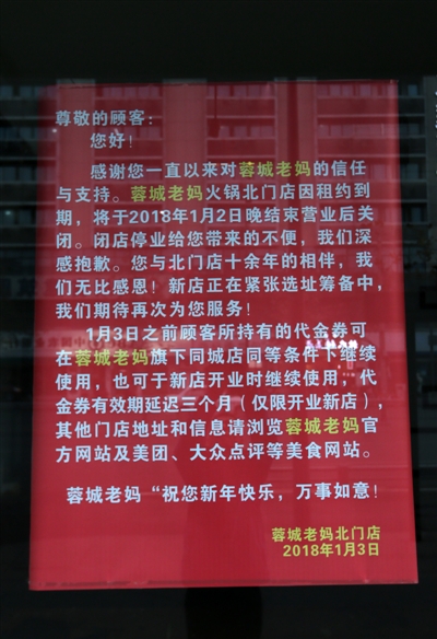 三層樓的蓉城老媽火鍋總店仍然在北門大橋旁邊佇立著,但是已經關門停業了,窗戶玻璃上掛著告示,“閉店停業給您帶來的不便,我們深感抱歉。您與北門店十余年的陪伴,我們無比感恩。”蓉城老媽方面承諾,之前顧客所持有的代金券可在蓉城老媽旗下同城店同等條件下繼續使用,也可于新店開業時繼續使用。